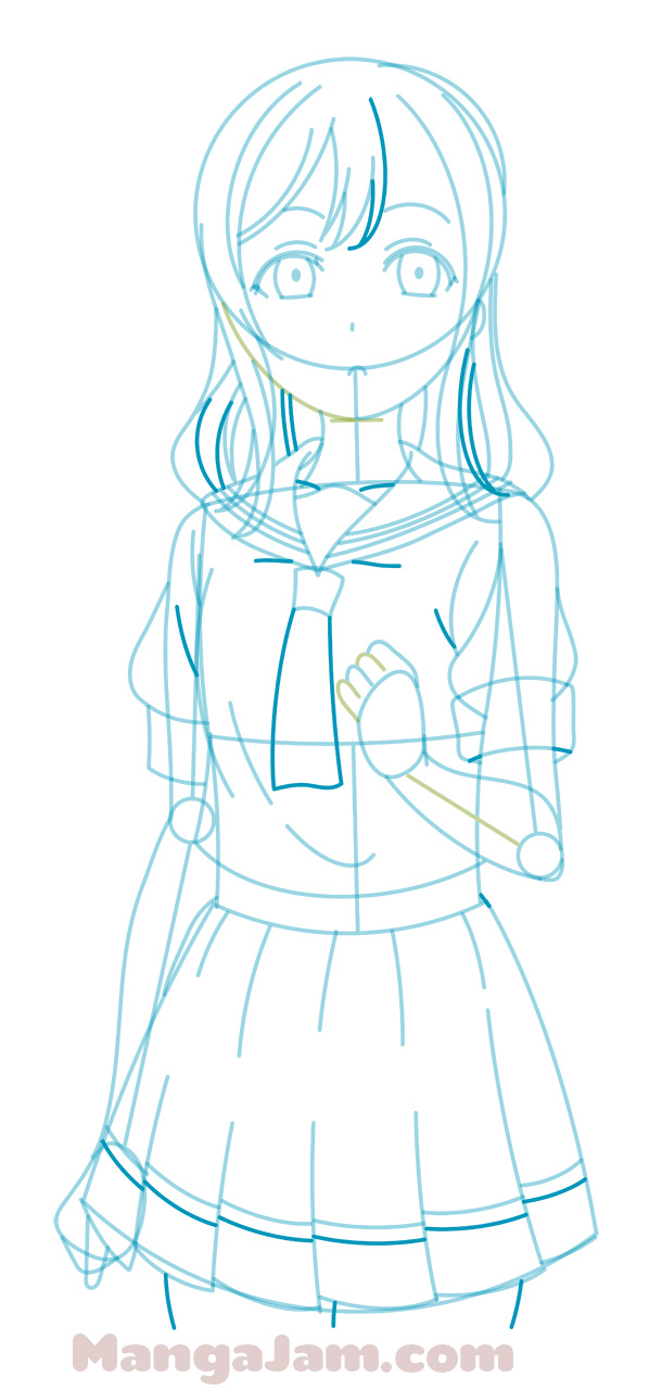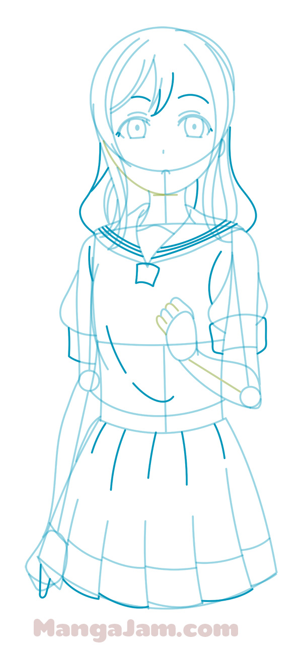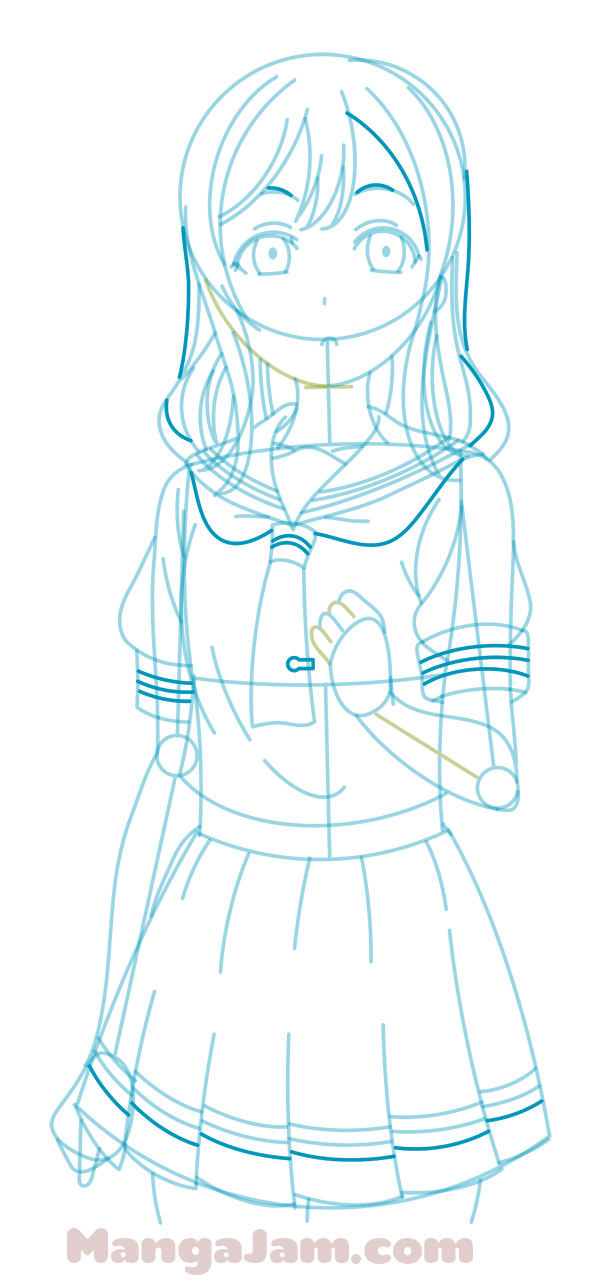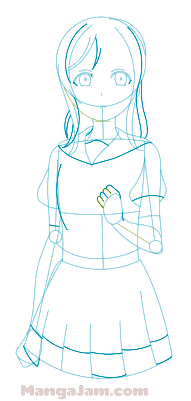 If your goal is to become a real Mangaka and design your own manga characters make sure to try to draw Kunikida Hanamaru from memory several times. Always compare the drawing to the original and correct any mistakes you see. Do this till you are happy with the result. It doesn’t have to look exactly the same, don’t sweat the details. The point is that you get the main shapes right and that it looks good. This is the best way to build a huge library of manga shapes in your memory that you can use to draw and design your own manga characters ^_-.